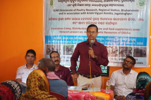 An awareness-cum-input distribution programme under the Network Project on Animal Genetic Resources (AnGR) was conducted at Acchutdaspur village, Erasama block of Jagatsinghpur district, Odisha on 18 March 2026 by Regional Station, DPR, Bhubaneswar. A total of 53 farmers (34 women and 19 men) participated in the programme. The programme commenced with a welcome address by Dr. Tapan Palai, Scientist, KVK, Jagatsinghpur. Dr. S. K. Bhanja, Principal Investigator of the Network Project, briefed the participants on the project activities, highlighting the status, conservation, and improvement of animal genetic resources in Odisha. Dr. B. K. Swain delivered a detailed lecture on feeding and feed management of ducks, cattle, sheep, and goats, including formulation and preparation using locally available feed resources. Dr. Dhirendra Kumar spoke on health management practices of native livestock. The Head and other scientists from KVK, Jagatsinghpur also graced the occasion. As part of the programme, kits containing veteriary medicines and feed supplements were distributed to the participating farmers.